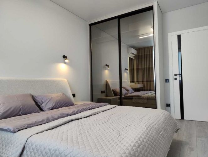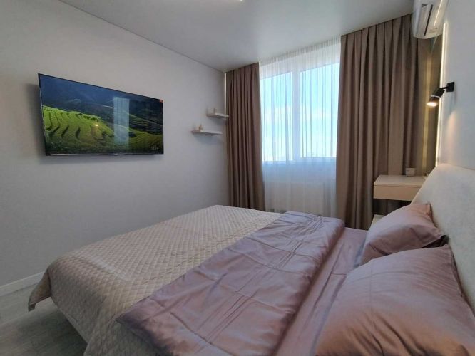 Повністю укомплектована якісними індивідуальними меблями, технікою (пральна і сушильна машинки, бойлер, два кондиціонери, два телевізора, вбудовані холодильник, духовка, мікрохвильова піч, індукційна плита, витяжка; і багато іншого.)