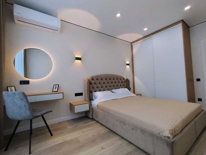 Простора квартира 48 м2, (кухня-вітальня, окрема спальня, коридор санвузол з ванною, Гардеробна). Виконано якісний, ремонт по перевіреному дизайн-проекту в сучасному класичному стилі! Індивідуальні меблі, якісна побутова техніка(пральна машинка, варильна поверхня, мікрохвильовка, духова шафа, холодильник смарт телевізор, кондиціонери), тепла підлога, топове зоноване освітлення