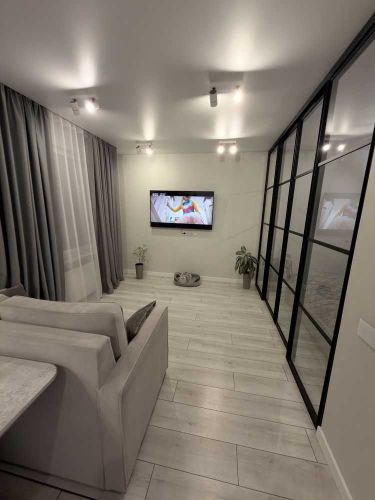 Загальна площа квартири= 36,7 м2; Планування: коридор, кухня і вітальня суміжні (студійка), спальна зона виділена окремо (відокремлена скляною loft-перегородкою з розсувною стстемою).