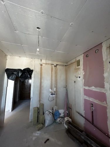 Квартира під чистове оздоблення (лазерна стяжка підлоги, машина штукатурка стін), частково зроблена електрика та сантехніка. А також було встановлено вікно на балконі .
