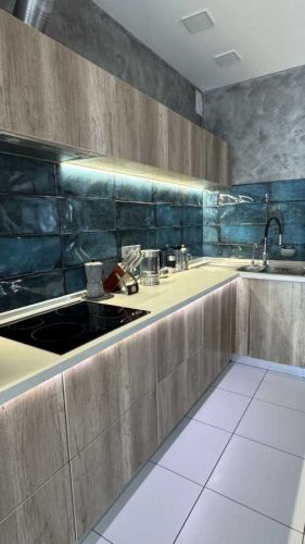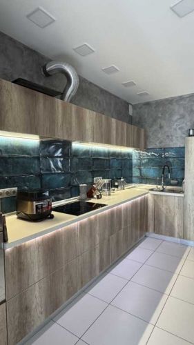 Кухня-гостинна зонована по підлозі плиткою та якісним ламінатом.