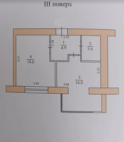 Цегляний будинок, квартира розьташована на зручному 3 поверсі. Загальна площа 39,1 кв.м, гарне та продумане планування.