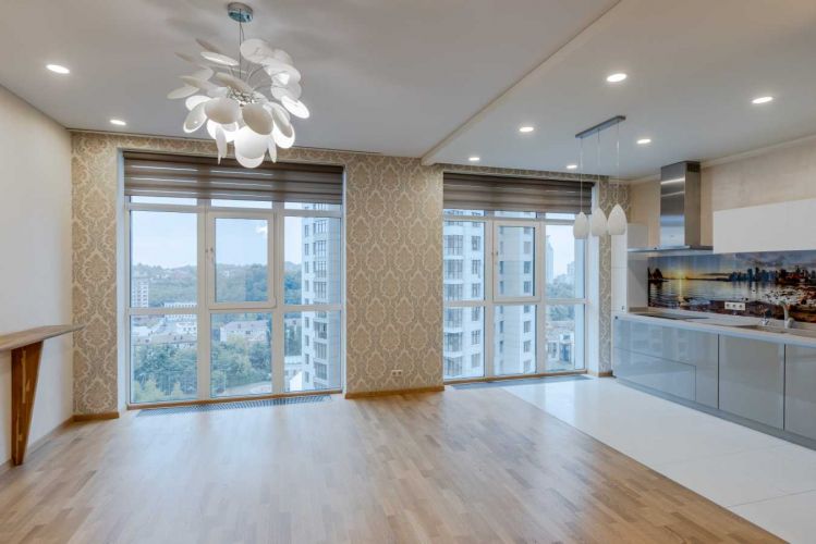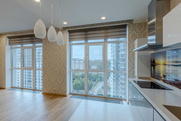 - Кухня-вітальня з панорамними вікнами й виходом на балкон
