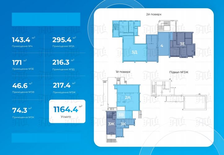 Приміщення розташовані на першому, другому поверсі і в підвалі. Всі приміщення зареєстровані в реєстрі нерухового майна, як окремі об'єкти нерухомого майна. Площа підвалу, якій входить до приміщень 3Ж складае, згідно реєстру 96.7 м2, хоча фактично становить 250 м2. Приміщення 3К 74.3 м2 продано (фото 9).