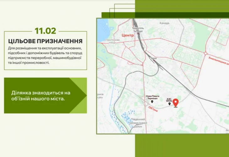 Пропонуємо у власність земельну ділянку загальною площею 5,7 га в місті Тернопіль по вулиці Об #700;їздна. Цільове призначення ділянки (код 11.02) дозволяє використання для розміщення та експлуатації будівель і споруд підприємств у різних промислових сферах.