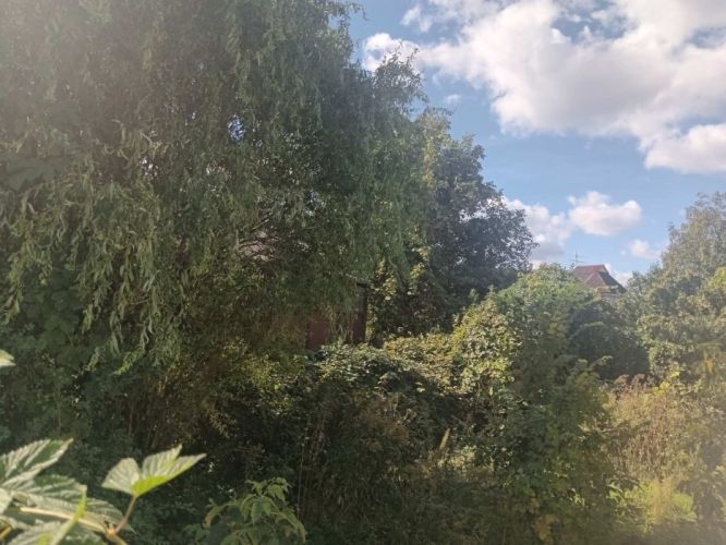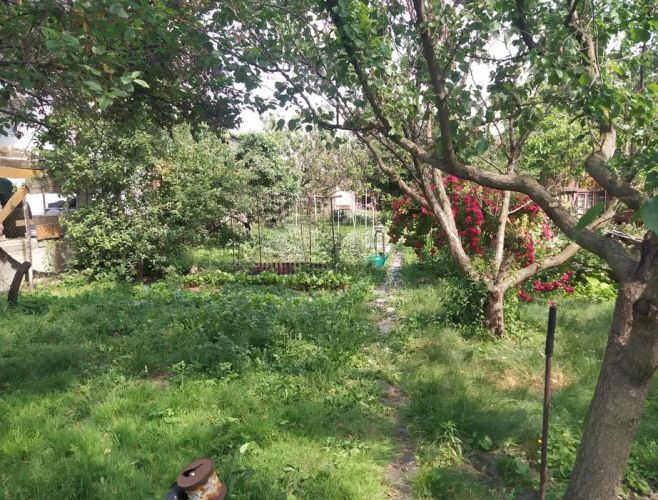 На ділянці старий будиночок, плодові дерева.