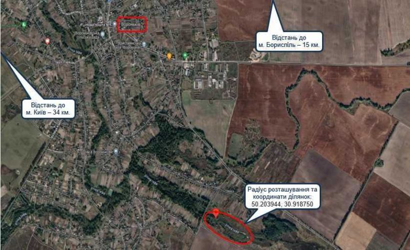 Пропонуються до продажу суміжні земельні ділянки загальною площею 12,0000 га, які знаходяться за межами населеного пункту за адресою: Київська обл., Бориспільський р-н, Вороньківська с/р.